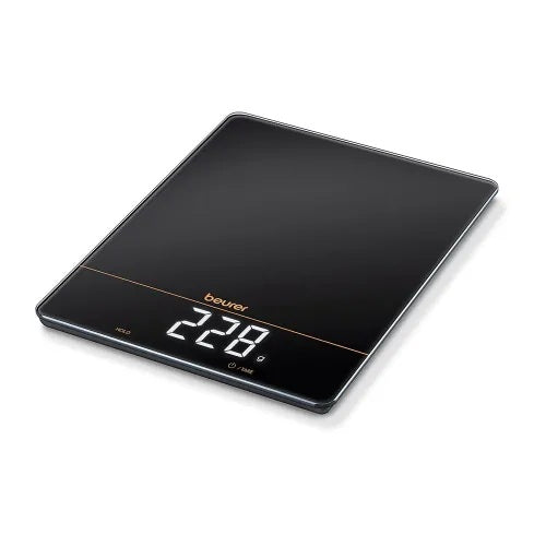 The Beurer KS 34 is a modern glass kitchen scale with an extra high 15 kg capacity (approx. 33 lb). Its Magic LED display stays invisible until weighing starts, then shows clear readings. Features practical hold function, tare, and unit switching.