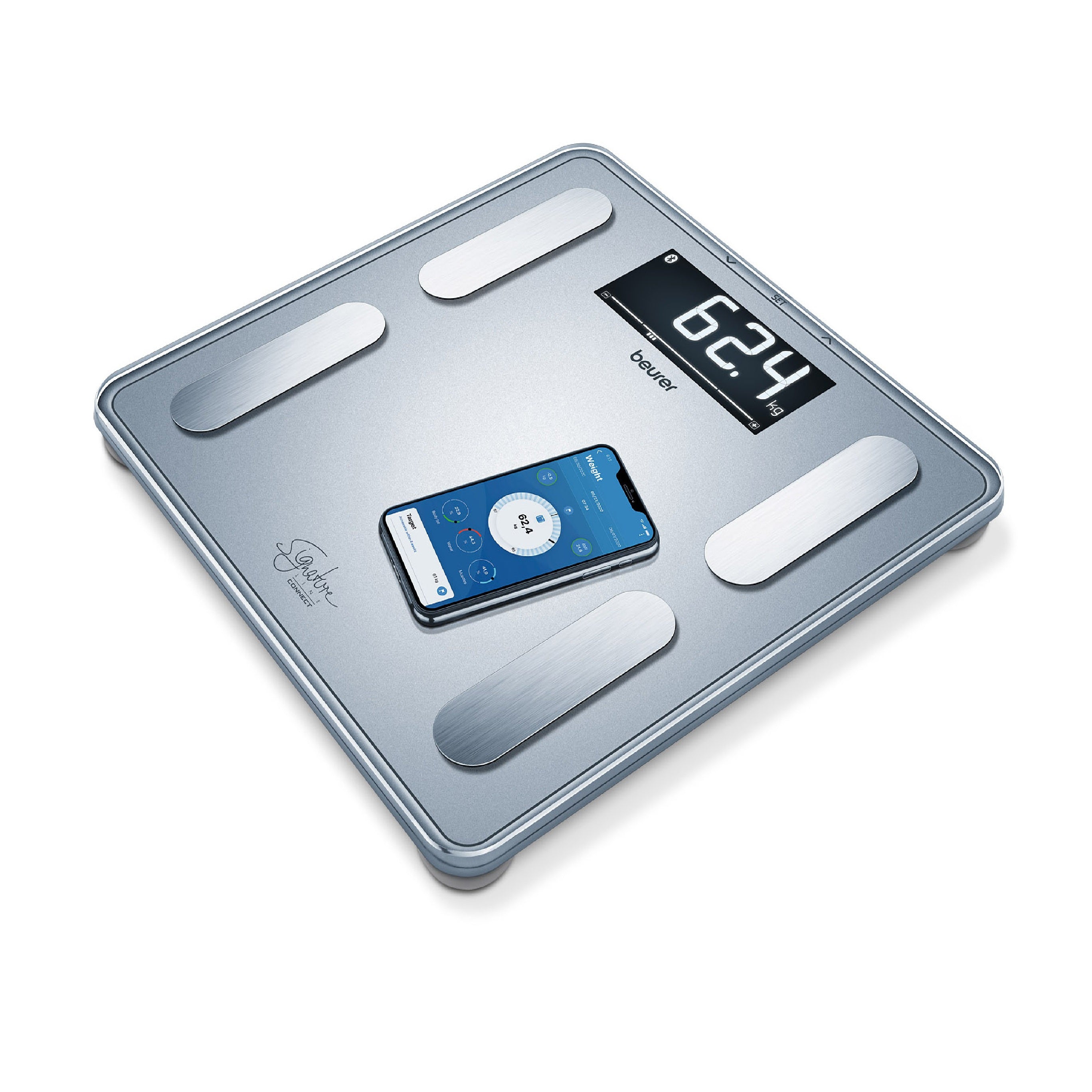 Beurer BF 405 BT (Signature Line) is a connected diagnostic scale with Bluetooth® Low Energy for automatic data transfer to the beurer HealthManager Pro app. It calculates weight, body fat, body water, muscle percentage, bone mass, BMI, and displays calorie requirements (BMR/AMR). Features 5 activity levels, 8 user memories with auto user recognition, quick start technology, auto switch off, unit switching (kg/lb/st) and brushed steel electrodes. Premium build with 8 mm safety glass and an illuminated XL display (52 × 119 mm, 35 mm digits). Extra high capacity: 200 kg.