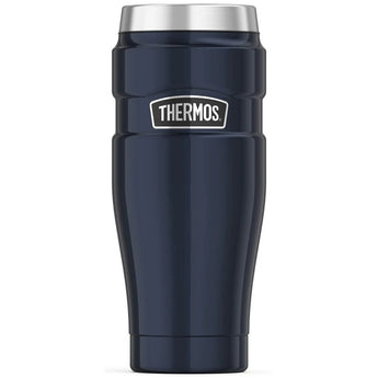 THERMOS Stainless King 470 ml travel tumbler in Midnight Blue. Double wall vacuum insulation delivers up to 7 hours hot and 18 hours cold; sweat proof and cool to the touch exterior. Durable 18/8 stainless steel inside and out, easy clean lid with drink lock, fits most car cup holders; BPA free.