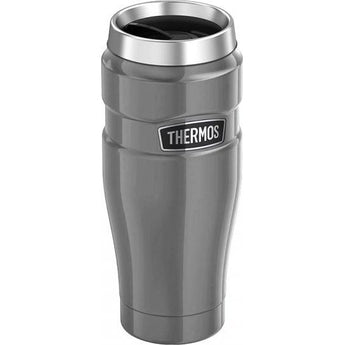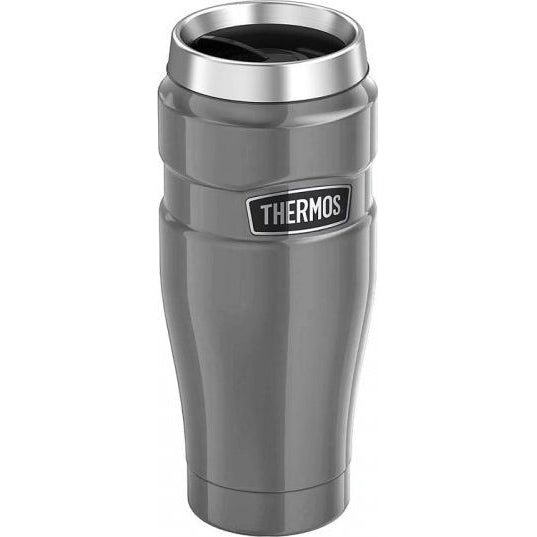 THERMOS Stainless King 470 ml tumbler (Cool Grey) with double wall vacuum insulation. Sweat proof, cool to the touch exterior; robust 18/8 stainless steel body and locking, easy clean lid.
