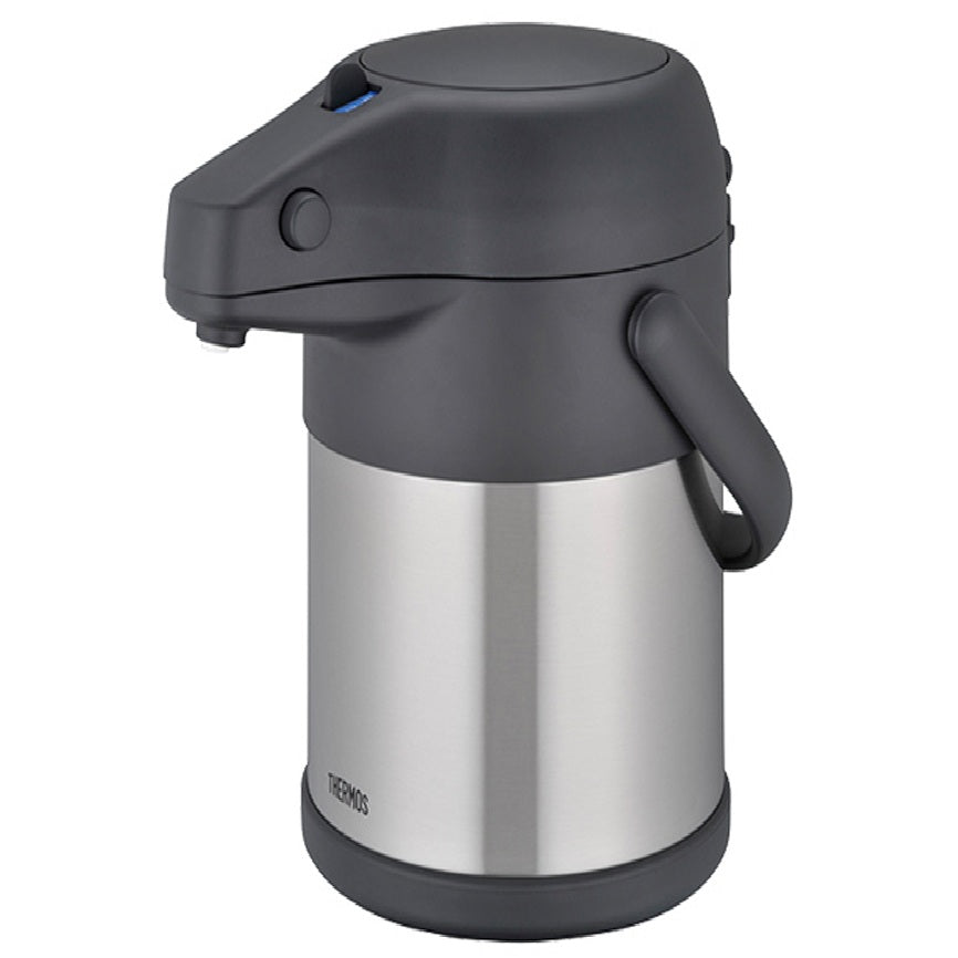 Thermos TAH 3000SBK 3 litre stainless steel vacuum pump pot. Large capacity airpot with push button dispensing, carry handle and durable SS shell—ideal for offices and events.